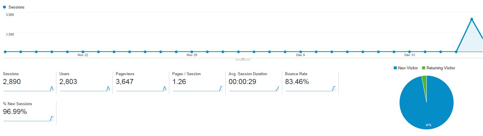 Untuk studi kasus, saya gunakan website testing saya. Website saya ini umur 3 hari, selesai dikerjakan hari Selasa malem, dengan total 5 artikel. Kemudian saya share di akun Facebook anonim saya. Dan hasilnya, hari Rabu menghasilkan 2800 visitor, Kamis 527 visitor, dan hari ini masih ramai.